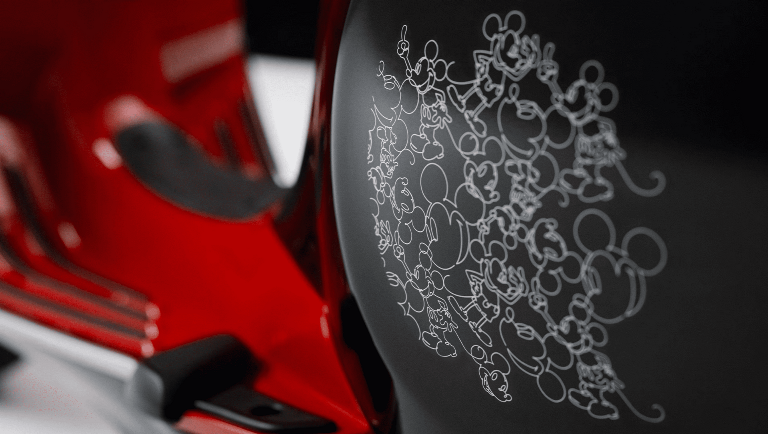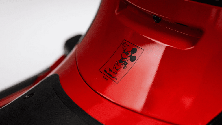 Sementara cermin hitam menggambarkan telinga Mickey yang bulat menggemaskan. Pola siluet sang karakter menghiasi kedua sisi dan bagian depan kendaraan. Terakhir, tanda tangan Mickey Mouse di jok dan kerangka depan siap menarik perhatian.