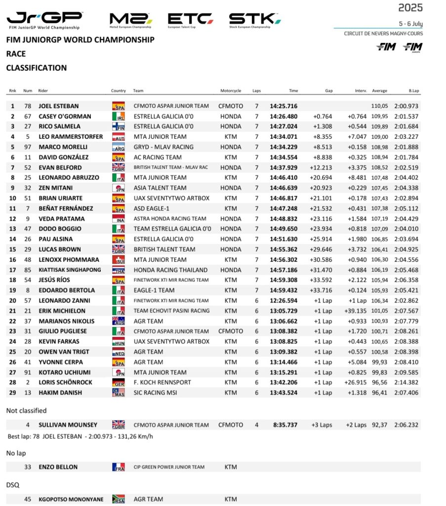 Sehingga hasil balapan JuniorGP 2025 di Sirkuit Magny Cours, Prancis, balapan dimenangkan oleh Joel Esteban, pembalap Spanyol dari CFMoto Aspar Junior Team. Menyusul di posisi runner up adalah pembalap Casey O’Ogorman (Estrella Galicia O’O) dan di podium 3 ada Rico Salmela yang juga dari tim Estrella Galicia O’O.