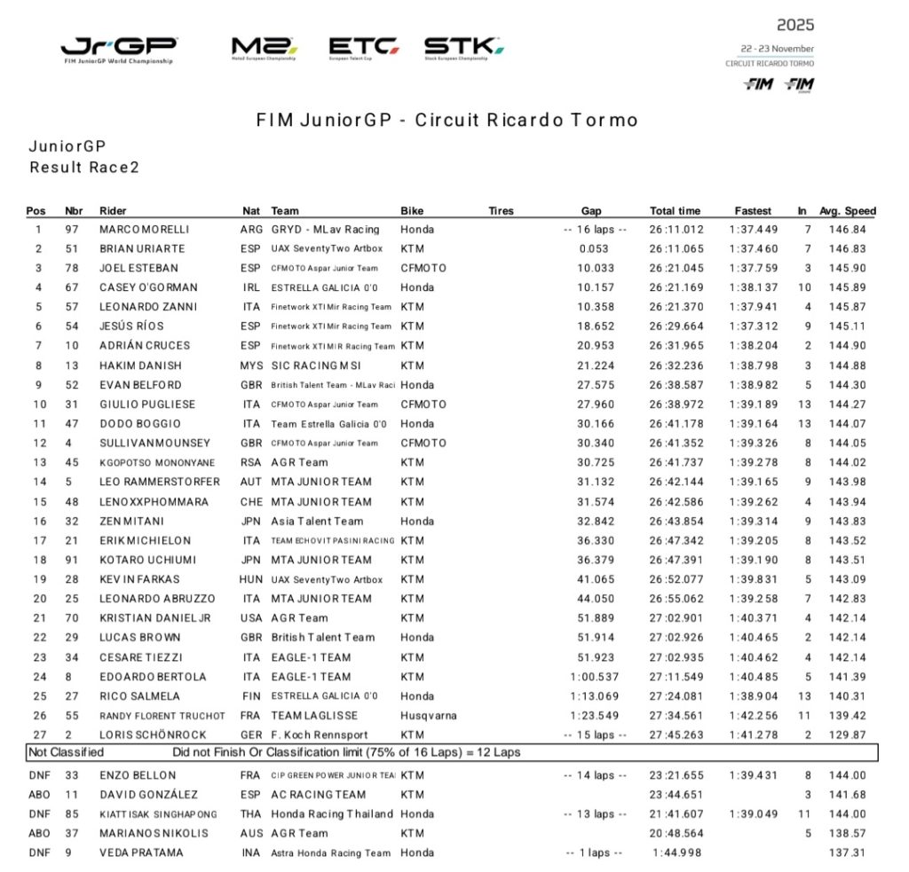 Balapan Race 2 sendiri kembali dimenangkan oleh Marco Morelli fan Brian Uriarte. Marco Morelli, pembalap dari Argentina yang membawa bendera tim GRYD – MLav Racing dengan tunggangan motor balap Honda finish di peringkat terdepan. Pembalap asal Spanyol, Brian Uriarte dari UAX SeventyTwo Artbo Racing Team yang mengendari KTM harus puas di podium 2. Kedua pembalap ini juga masing-masing finish di posisi yang sama pada Race 1.