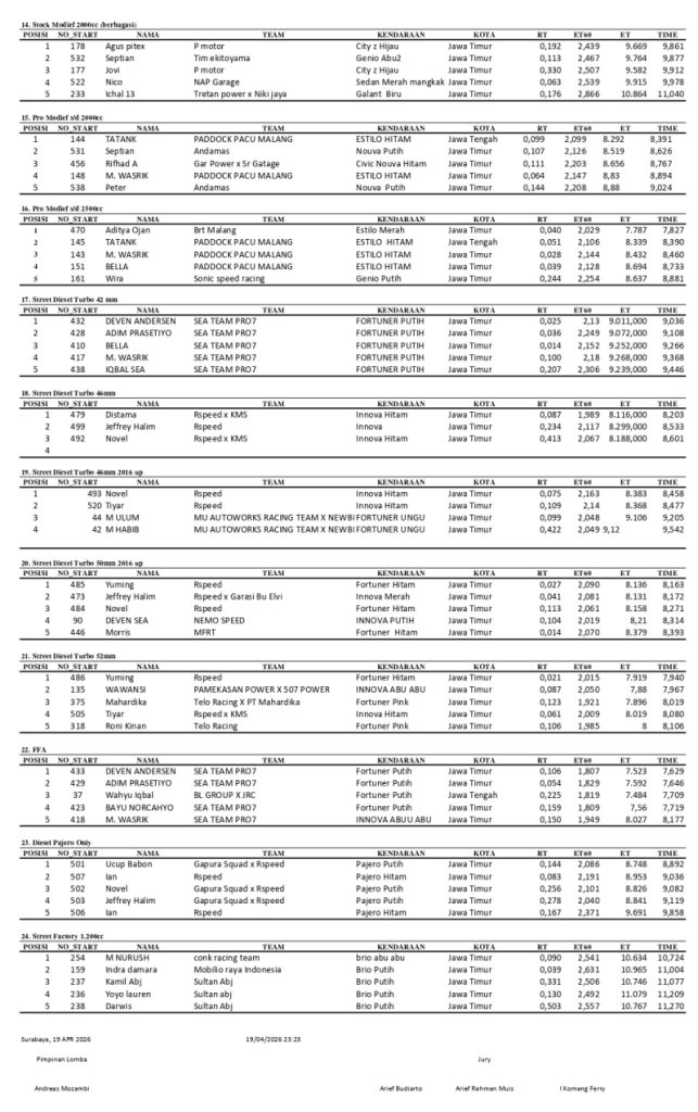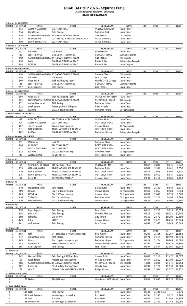 Kejuaraan Nasional (Kejurnas) Drag Race 2026 sukses digelar di Sirkuit Kenjeran Surabaya pada 18 –19 April 2026.