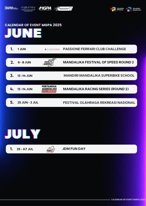 Mandalika Grand Prix Association (MGPA) sebagai pihak yang mengelola dan mengoperasikan Sirkuit Internasional Mandalika telah merilis jadwal balap musim 2025.