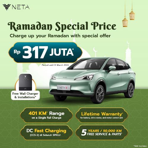 “Pada momen istimewa ini, NETA ingin menyambut bulan Ramadan dengan menawarkan harga spesial untuk para calon konsumen NETA V. Tentunya tidak hanya memberikan keuntungan dari segi harga, kami juga menghadirkan beragam keuntungan lainnya mulai dari layanan purna jual hingga jaminan garansi,” ujar Jerry Huang, Managing Director, PT NETA Auto Indonesia.