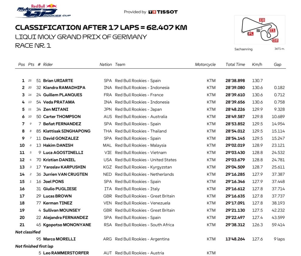 Sementara iu, di Sirkuit Sachsenring yang basah dan licin, Brian Uriarte mencuri kemenangan gemilang dari pemimpin balapan, Kiandra Ramadhipa, dalam dua tikungan terakhir. Kemenangan ini merupakan raihannya yang ke-4 bagi pembalap Spanyol berusia 16 tahun itu di Red Bull MotoGP Rookies Cup 2025.