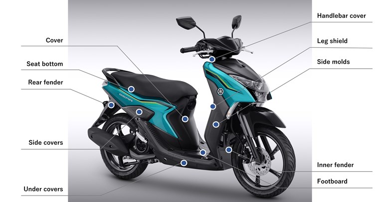 Inisiatif untuk beralih ke bahan mentah yang berkelanjutan juga tidak terbatas pada komponen logam. Selama bertahun-tahun, Yamaha Motor telah bekerja untuk mempromosikan penggunaan alternatif daur ulang untuk bahan resin yang digunakan pada body sepeda motor.