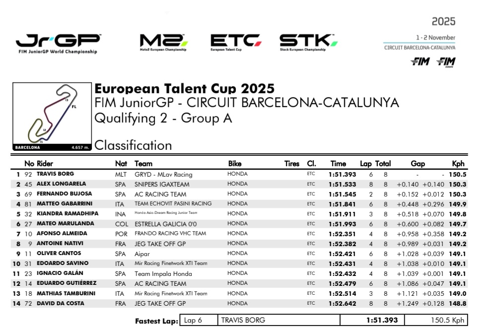 Sementara itu, kualifikasi grup A dikuasai oleh Travis Borg dari tim GRYD – MLav Racing dengan waktu terbaik 1 menit 51.39 detik. Lalu terbaik kedua adalah Alex Longarela, pembalap Spanyol dari SNIPERS IGAX TEAM yang menorehkan waktu 1 menit 51.533 detik. Terbaik ketiga adalah Fernando Bujosa dari AC RACING TEAM yang kemas waktu 1 menit 51.545 detik.