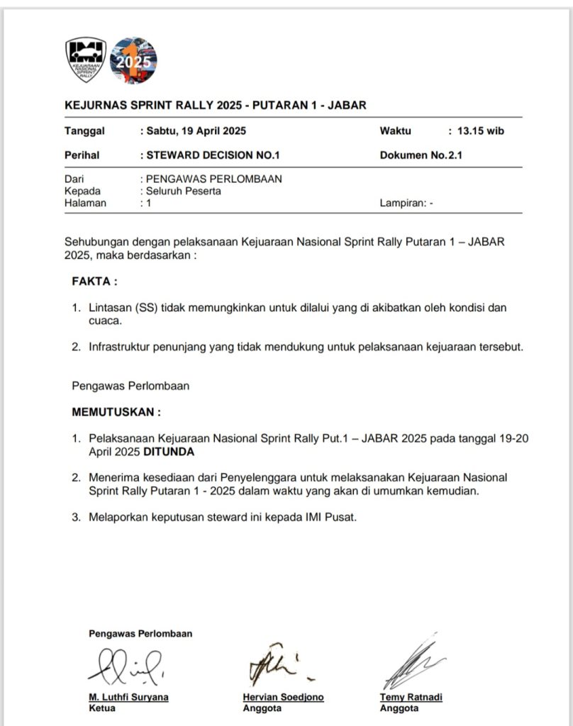 1. Pelaksanaan Kejuaraan Nasional Sprint Rally Putaran 1 – Jabar 2025 pada tanggal 19-20 April 2025 DITUNDA.