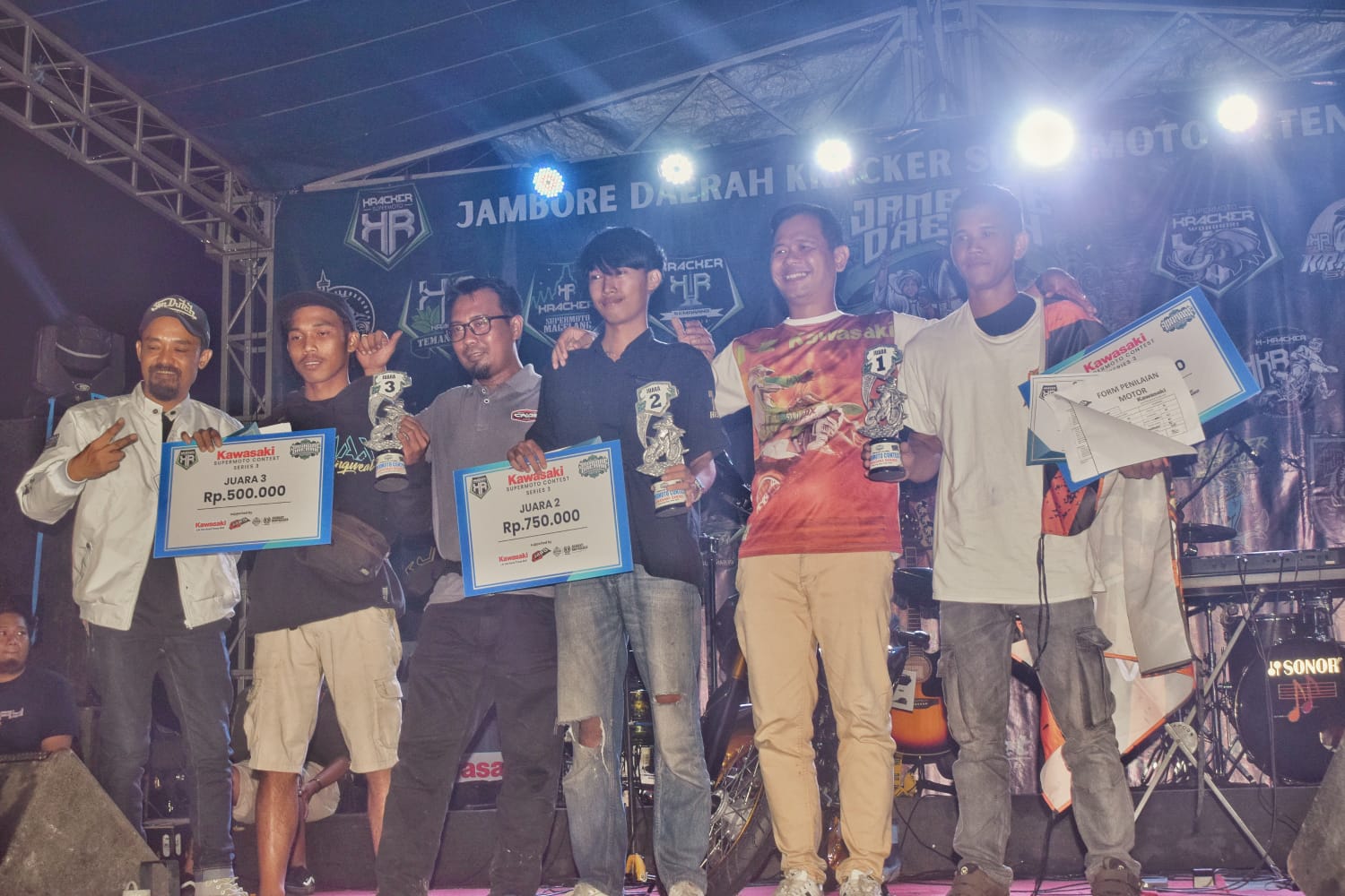 Dan lagi yang paling menarik adalah adanya doorprize yang dihadirkan oleh penyelenggara yaitu 1 unit sepeda motor yang membuat para peserta semakin penasaran. Di sela-sela hiburan dangdut, juga diselipkan pembagian hadiah kontes motor yang diserahkan langsung oleh Ketua Umum Kracker Supermoto, Amalga Purnamawan, Perwakilan dari Kawasaki SumberBuana, Heri dan Dewan juri Lerry Rahmatrizky serta Ketua Panitia Ari Nugroho. Hadiah yang diterima berupa trophy, uang tunai, dan sertifikat yang ditanda tangani langsung oleh Kawasaki Motor Indonesia (KMI) Michael C. Tanadhi. (Maston/Foto: ist)