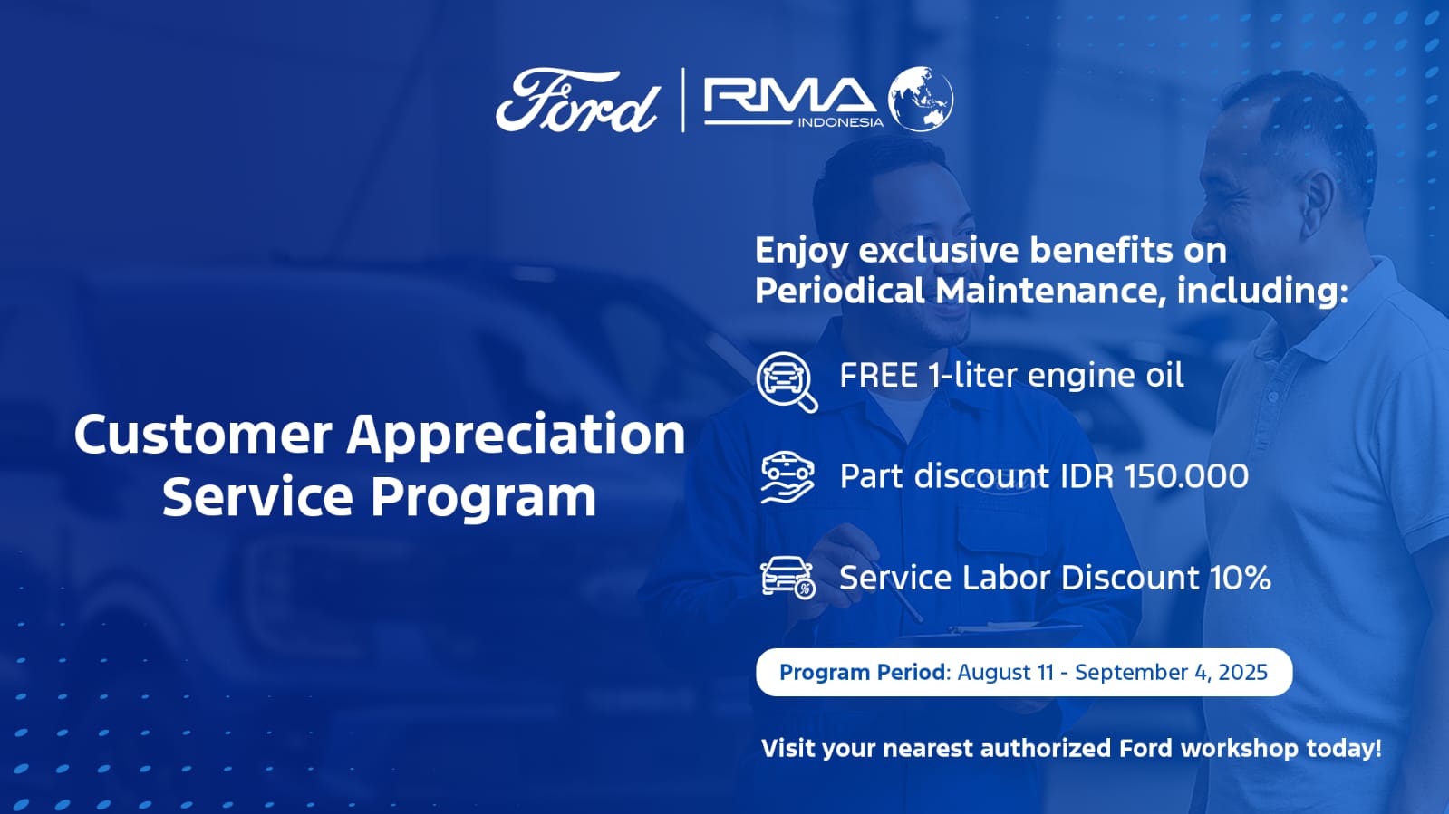 “Kami berharap program ini dapat dimanfaatkan sebaik-baiknya oleh seluruh pelanggan kami. Ini adalah bagian dari strategi jangka panjang kami untuk terus memperkuat kehadiran Ford di Indonesia, tidak hanya melalui produk-produk unggulan, tetapi juga melalui layanan after sales yang responsif dan berkualitas,” papar Elyus Dwi Erwanto, Head of Service Operations RMA Indonesia.