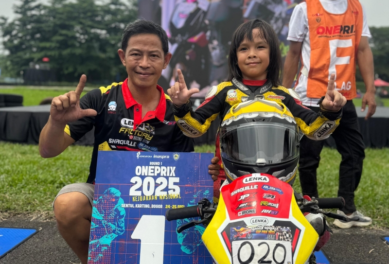 Pembalap cilik Fakhri Shaquille Habibillah dari LENKA Factory Racing Team tampil sebagai jawara di Putaran 1 Kejurnas OnePrix 2025.