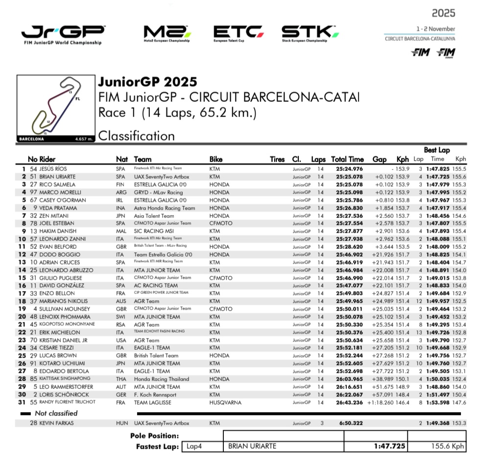 Sementara itu, Race 1 JuniorGP 2025 di Sirkuit Catalunya, Spanyol berhasil dimenangkan oleh Jesus Rios, pembalap asal Spanyol dari Finetwork XTI Mir Racing Team yang geber KTM. Di podium kedua adalah Brian Uriarte, pembalap asal Spanyol dari Tim UAX SeventyTwo Artbox yang juga mengandalkan motor balap KTM.